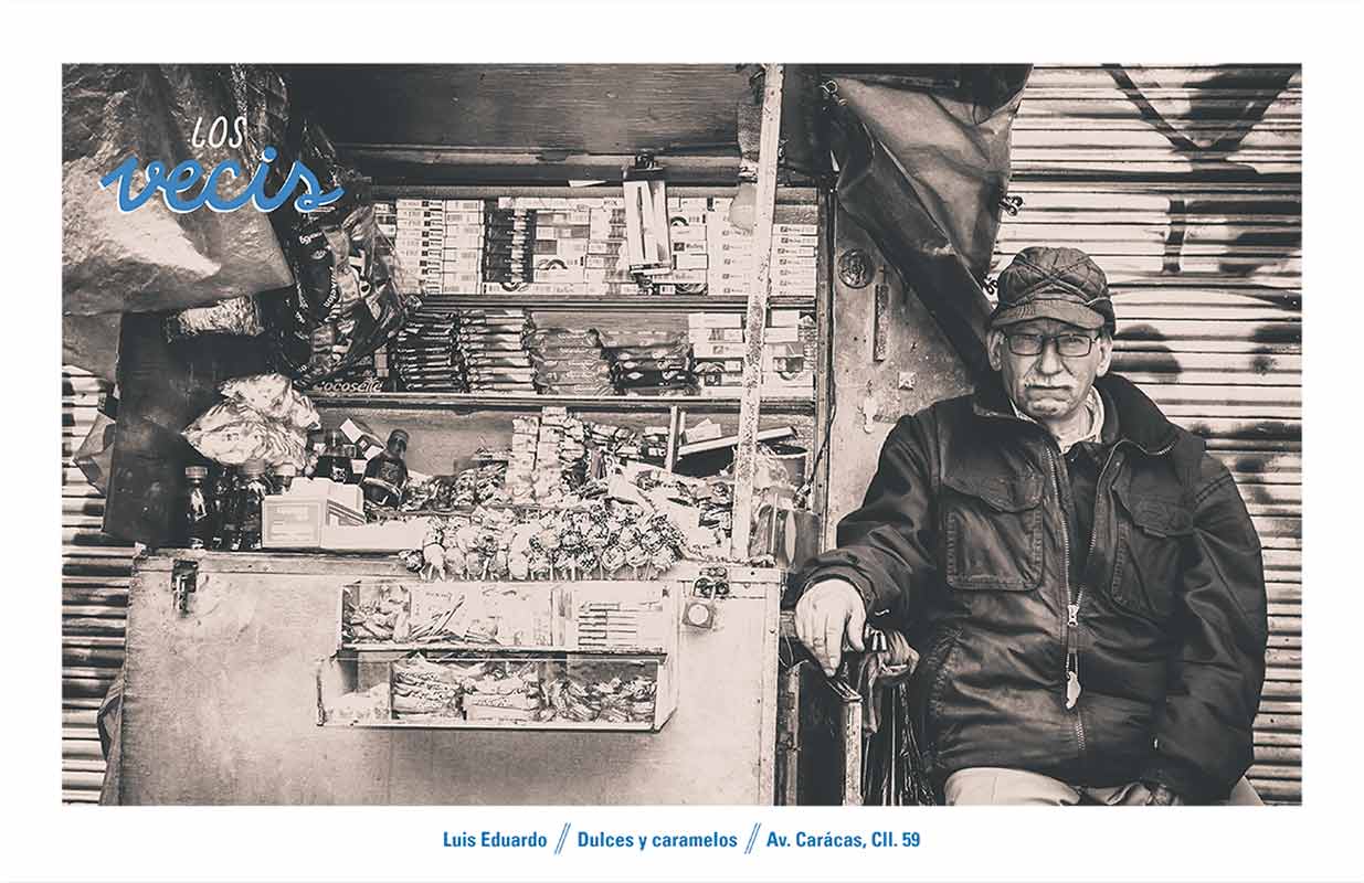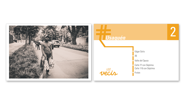 En el recorrido cotidiano de un ciudadano siempre están presentes los vendedores ambulantes, ya sea para comer fruta, comprar un cigarrillo, minutos o hasta comprar unas rosas. Con este proyecto se quiere generar la identidad nuestro vecinos así como la de dos o tres vendedores en particular, teniendo en cuenta su labor, su recorrido y lugares de trabajo. No sólo será hacer el identificador personal de los vendedores, también generar piezas que identifiquen a la persona en sí para darlos a conocer.